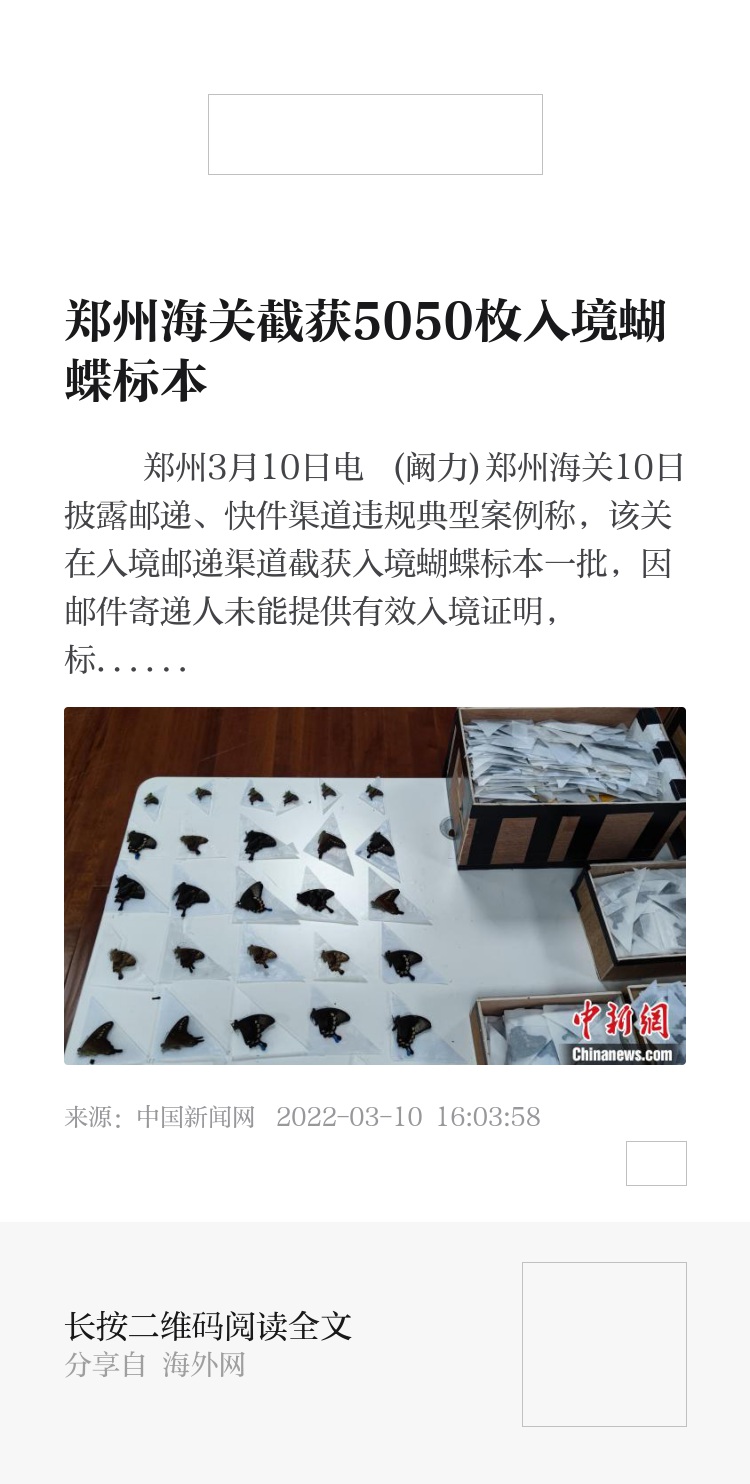 中新网郑州3月10日电 (阚力)郑州海关10日披露邮递、快件渠道违规典型案例称,该关在入境邮递渠道截获入境蝴蝶标本一批,因邮件寄递人未能提供有效入境证明,标本暂不予放行。