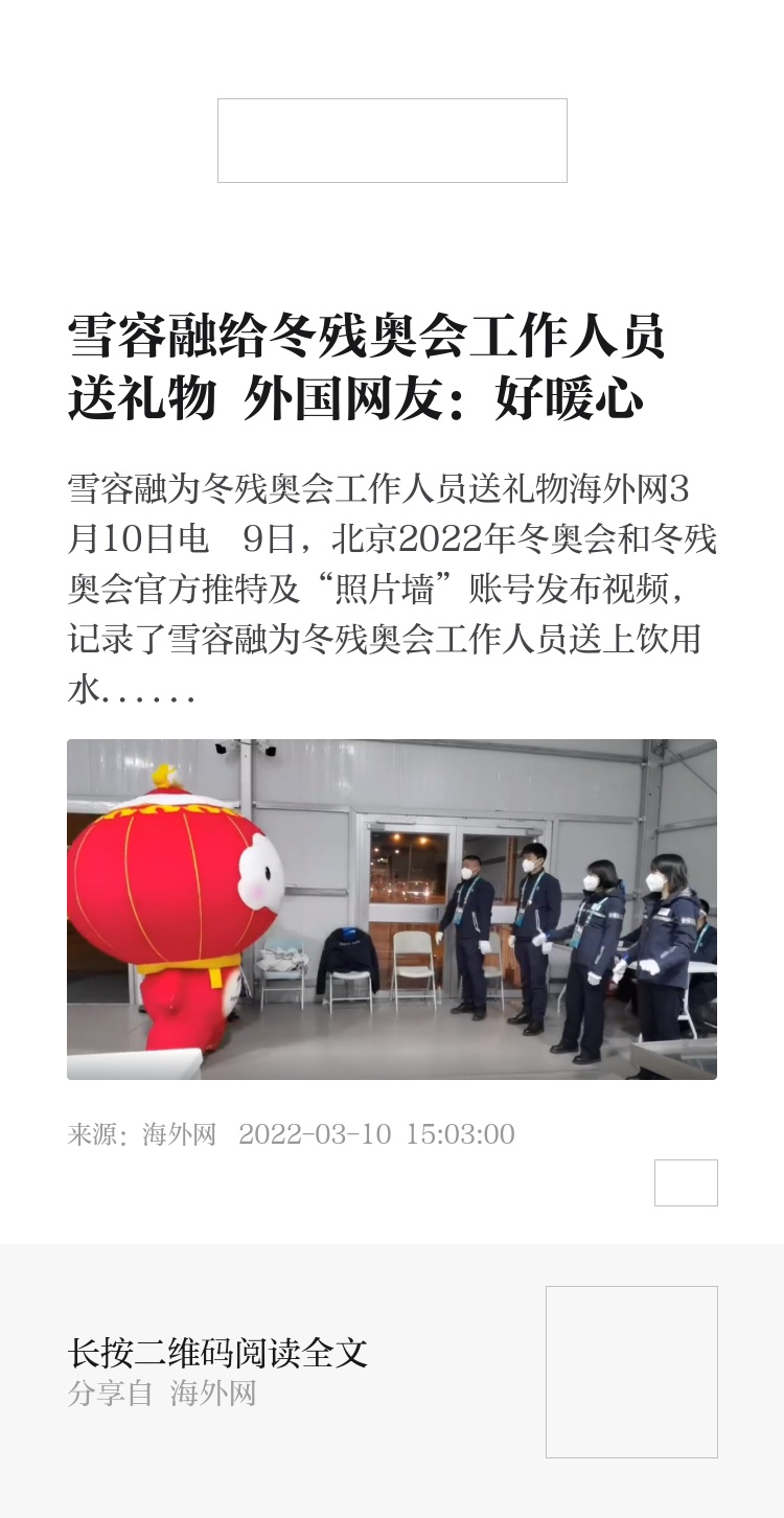 海外网3月10日电 9日,北京2022年冬奥会和冬残奥会官方推特及“照片墙”账号发布视频,记录了雪容融为冬残奥会工作人员送上饮用水、零食等小礼物。雪容融和工作人员的互动让外国网友直呼“好暖心”。