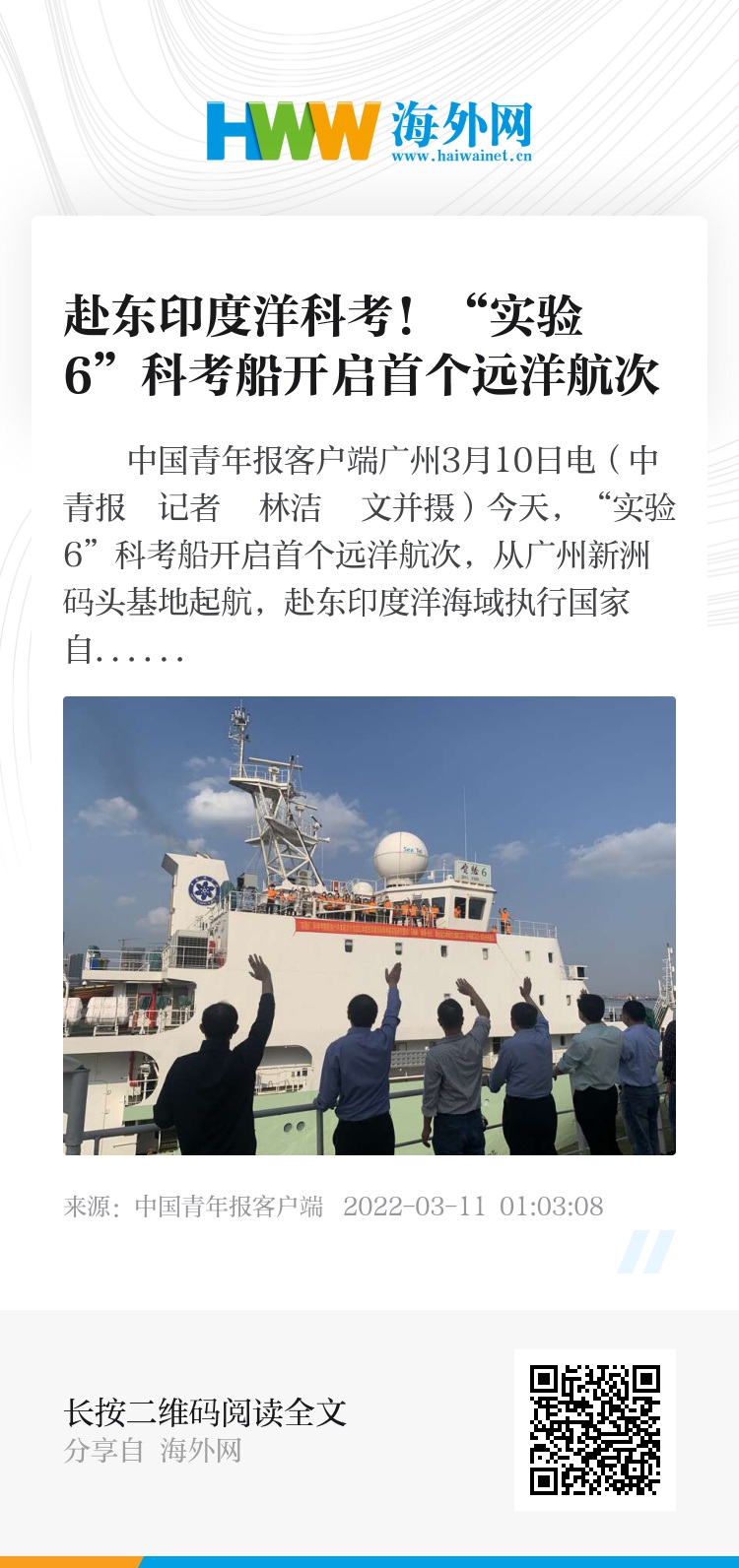 中国青年报客户端广州3月10日电(中青报・中青网记者 林洁 文并摄)今天,“实验6”科考船开启首个远洋航次,从广州新洲码头基地起航,赴东印度洋海域执行国家自然科学基金2022年东印度洋综合科学考察共享航次。此次预计海上作业85天,航程逾1万海里,是我国迄今最长的印度洋科考航次。