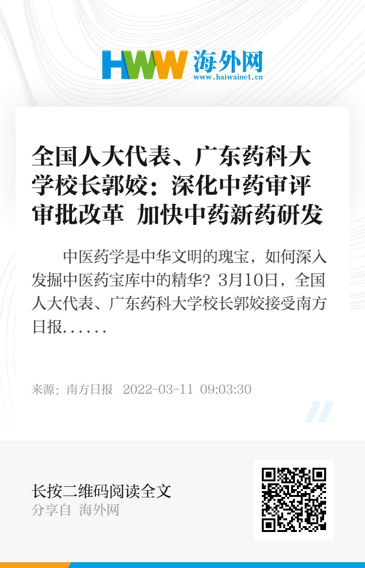 中医药学是中华文明的瑰宝,如何深入发掘中医药宝库中的精华?3月10日,全国人大代表、广东药科大学校长郭姣接受南方日报记者采访时说,走符合中医药特色规律的中药新药创新之路是中医药传承创新的必然选择。