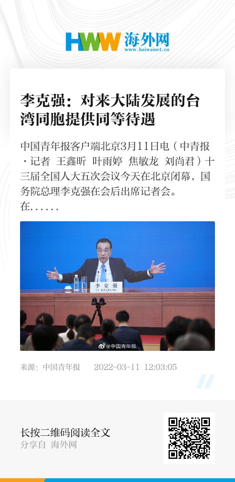 中国青年报客户端北京3月11日电(中青报·中青网记者 王鑫昕 叶雨婷 焦敏龙 刘尚君)十三届全国人大五次会议今天在北京闭幕,国务院总理李克强在会后出席记者会。在回答台湾记者提问时,李克强表示,对来大陆发展的台湾同胞提供同等待遇,为他们办实事,解难事。