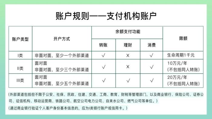 根据监管法规要求,对个人支付账户进行分类管理,根据用户实名验证的方式和渠道多少,划分为Ⅰ类户、Ⅱ类户、Ⅲ类户。