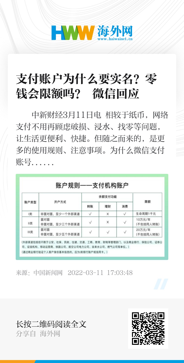中新财经3月11日电 相较于纸币,网络支付不用再顾虑破损、浸水、找零等问题,让生活更便利、快捷。但随之而来的,是更多的使用规则、注意事项。为什么微信支付账号要实名制?账户零钱会限额吗?11日微信官方回应。