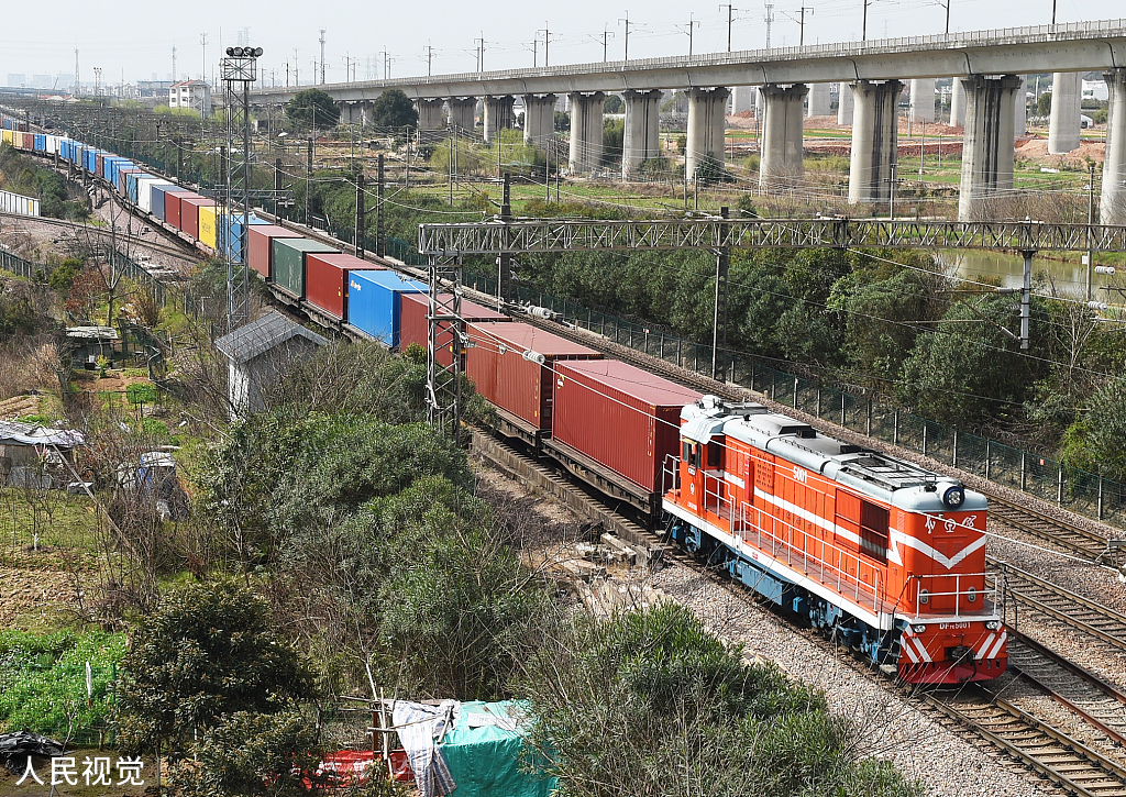 2022年3月10日,满载着100只标箱日用百货等货物的“义新欧”中欧班列从铁路浙江义乌西站鸣笛启程,奔赴13052公里外的西班牙首都马德里。至此,“义新欧”中欧班列义乌平台累计开行突破30万标箱。图片来源:人民视觉
