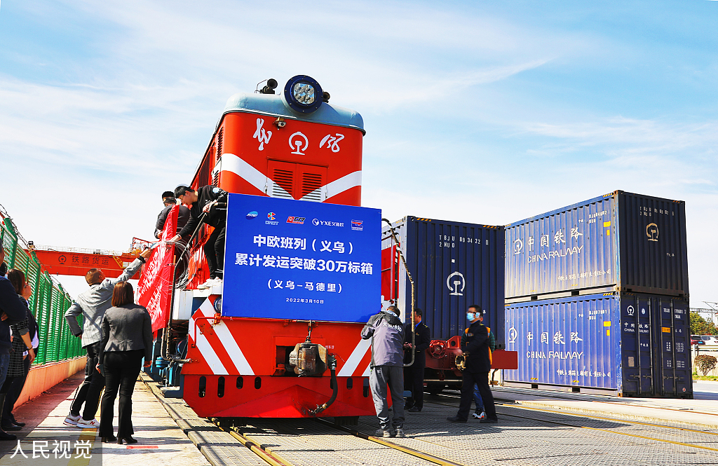 2022年3月10日,满载着100只标箱日用百货等货物的“义新欧”中欧班列从铁路浙江义乌西站鸣笛启程,奔赴13052公里外的西班牙首都马德里。至此,“义新欧”中欧班列义乌平台累计开行突破30万标箱。图片来源:人民视觉