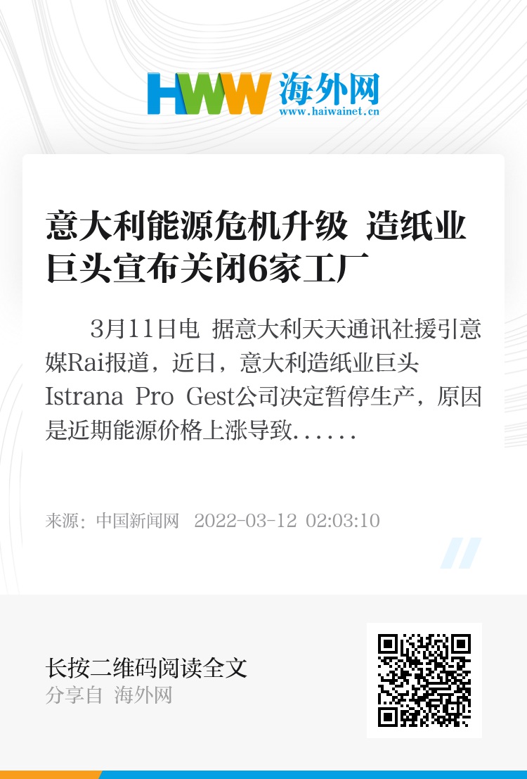 中新网3月11日电 据意大利天天通讯社援引意媒Rai报道,近日,意大利造纸业巨头Istrana Pro Gest公司决定暂停生产,原因是近期能源价格上涨导致水电费高企。报道称,该公司的400名员工将因此停职在家。