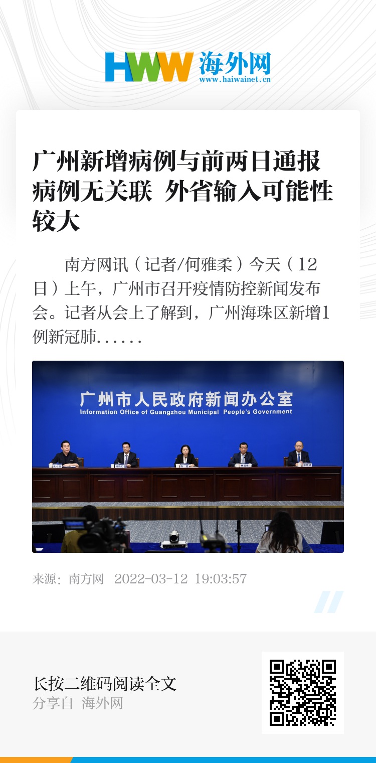 广州市卫生健康委副主任陈斌通报,病例,男,31岁,从事销售工作。3月8日从外市乘飞机来穗,入住海珠区江南大道中漫豪思酒店,当晚核酸检测结果阴性;8日至10日在穗活动场所涉及海珠、越秀、白云、番禺等区;10日晚,出现发热、咳嗽、肌肉酸痛症状;11日,核酸检测结果初筛阳性,即采取健康管理措施,经复核阳性后,当日闭环转运至广州医科大学附属市八医院隔离,经医疗救治专家组综合临床、影像学表现和实验室检测结果,诊断为新冠肺炎确诊病例(轻型),目前病情稳定。