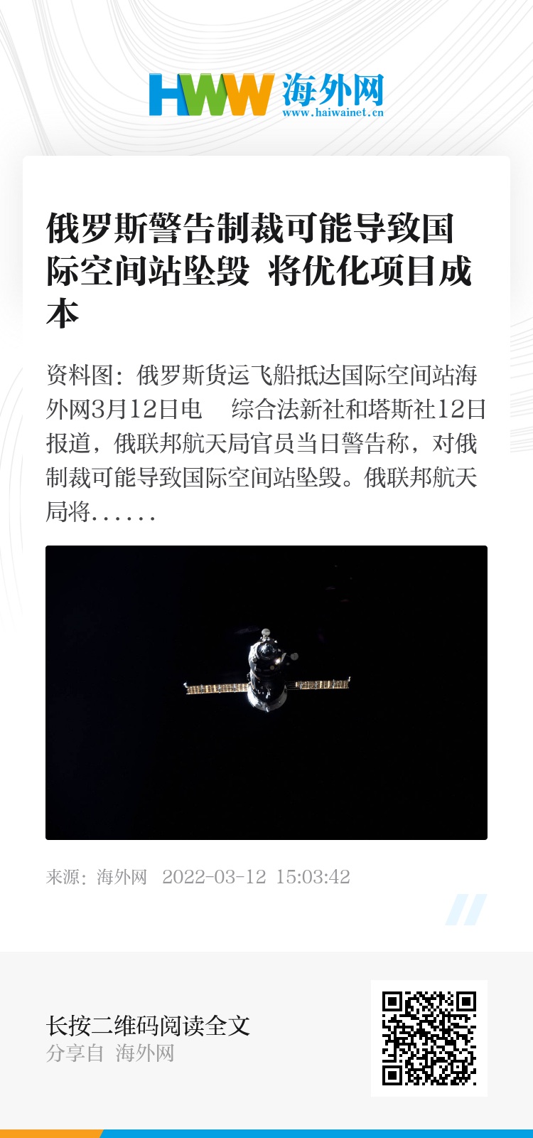 海外网3月12日电 综合法新社和塔斯社12日报道,俄联邦航天局官员当日警告称,对俄制裁可能导致国际空间站坠毁。俄联邦航天局将计划对国际空间站(ISS)项目成本进行优化。