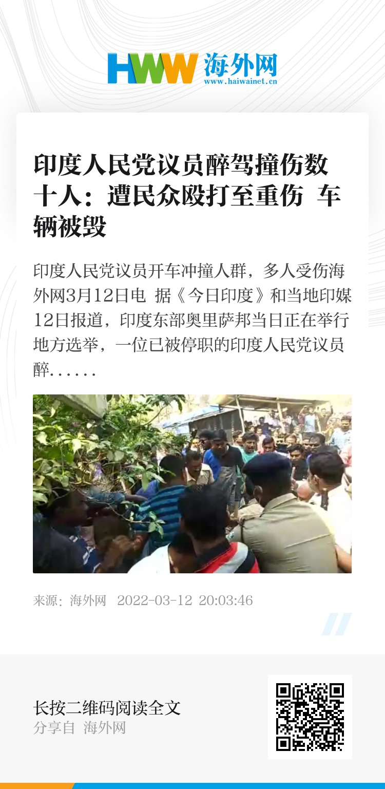 海外网3月12日电 据《今日印度》和当地印媒12日报道,印度东部奥里萨邦当日正在举行地方选举,一位已被停职的印度人民党议员醉驾前往选区,将选举办公室外至少23人撞伤,其中包括7名警察。这位议员随后遭到当地民众殴打,伤势严重,被送往医院。