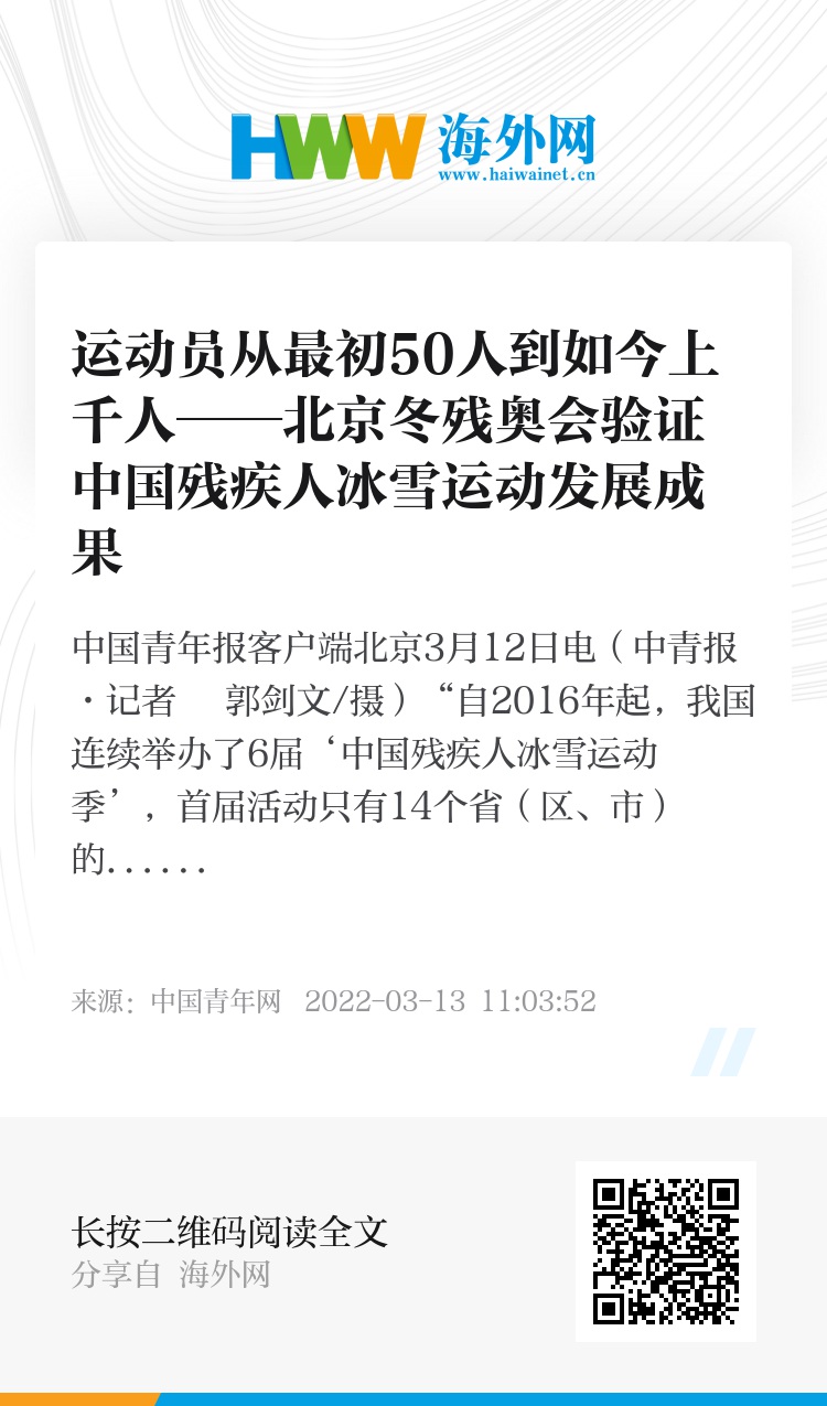 中国青年报客户端北京3月12日电(中青报·中青网记者 郭剑文/摄)“自2016年起,我国连续举办了6届‘中国残疾人冰雪运动季’,首届活动只有14个省(区、市)的大约1万人参加,发展到现在有全国31个省(区、市)参加,单季人次超过30万。目前我国已经有8所特殊教育学校被确定为冰雪特色学校,7所特殊教育学校被确定为冬奥冬残奥奥林匹克教育示范学校。”亲身经历了2008北京残奥会和2022北京冬残奥会的北京冬奥组委遗产项目负责人刘兴华说:“在残疾人冰雪运动的竞技层面,全国冬残奥运动员由最初不足50人发展至上千人,技术官员从零到上百人,冬奥项目从2个拓展到全部6个,实现冬残奥比赛大项全覆盖,这充分说明了残疾人冰雪运动的发展成果。”