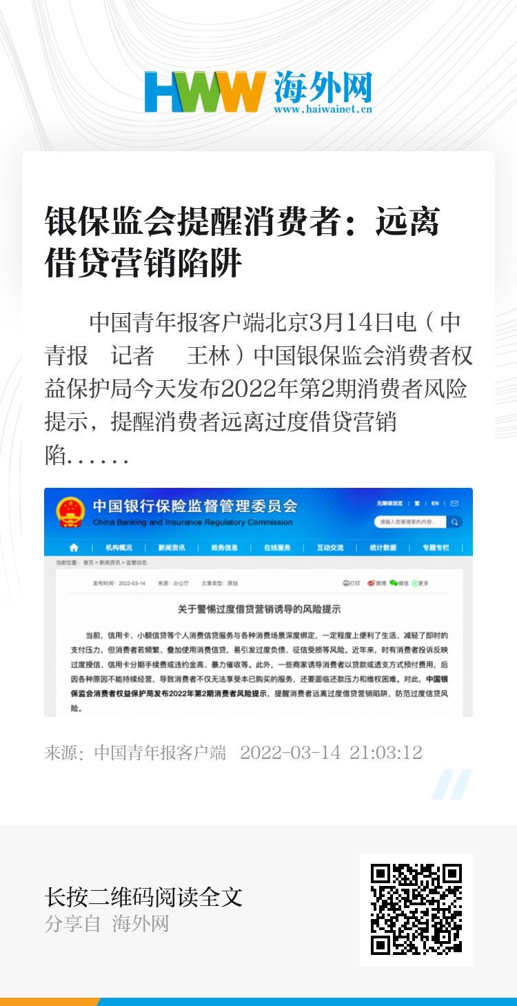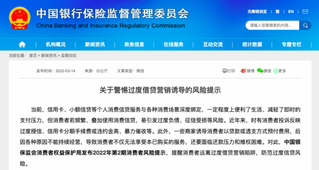 中国青年报客户端北京3月14日电(中青报・中青网记者 王林)中国银保监会消费者权益保护局今天发布2022年第2期消费者风险提示,提醒消费者远离过度借贷营销陷阱,防范过度信贷风险,主要包括四种风险:诱导消费者办理贷款、信用卡分期等业务,侵害消费者知情权和自主选择权;诱导消费者超前消费;诱导消费者把消费贷款用于非消费领域;过度收集个人信息,侵害消费者个人信息安全权。