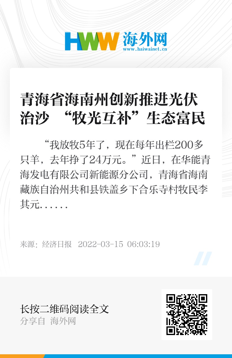 华能新能源公司是首批入驻海南州绿色产业发展园区的光伏发电企业,至今已建成14个光伏电站,去年实现产值1.8亿多元。同时,作为下合乐寺村定点帮扶企业,华能新能源公司在当地大力发展光伏电场生态畜牧业。“企业发展了,生态恢复了,‘光伏羊’成了意外收获。”下合乐寺村党支部书记陈列东主介绍,光伏电场的光伏板需定期清洗,给降雨稀少的草原荒滩补给了水分,牧草拔节生长;光伏电场需除草防火,牧民的牛羊又成了“割草机”,“真是一举两得”。