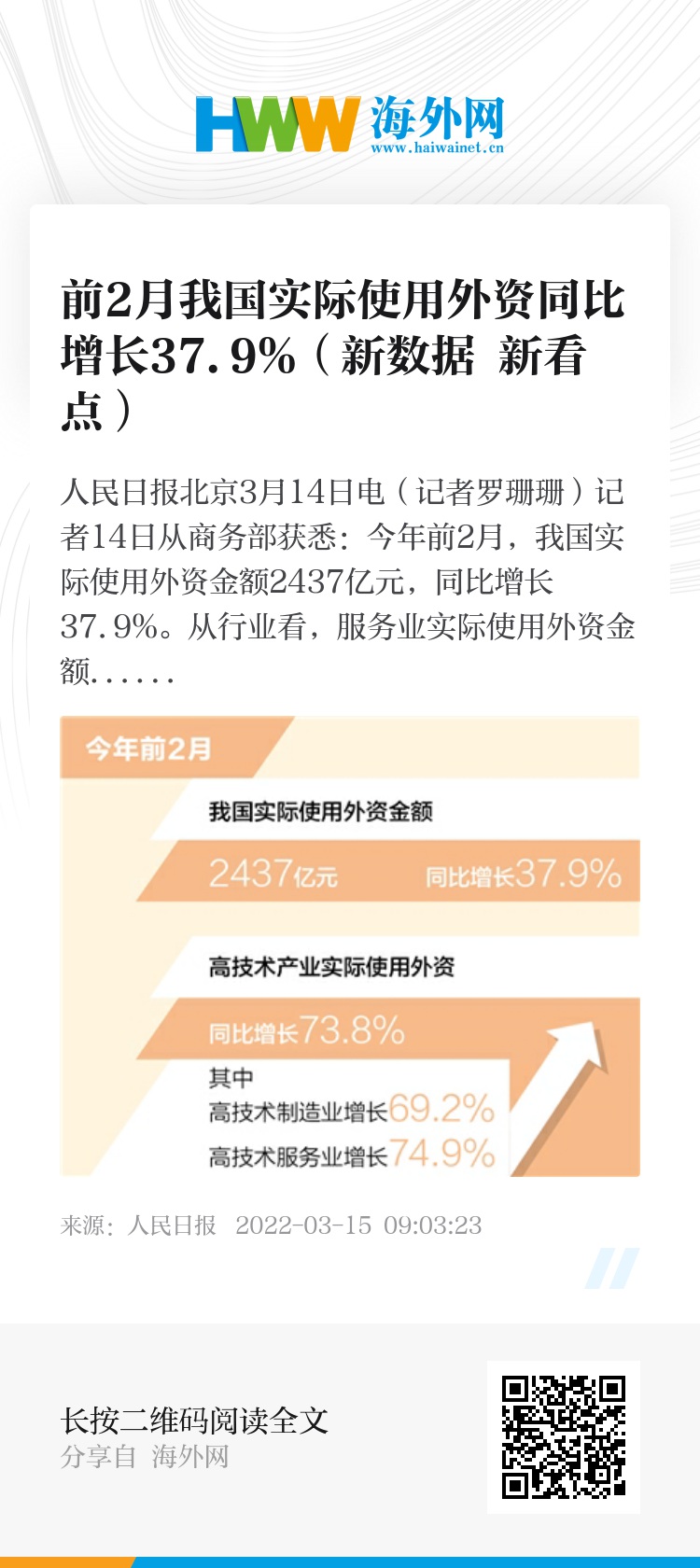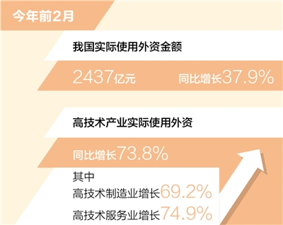 人民日报北京3月14日电(记者罗珊珊)记者14日从商务部获悉:今年前2月,我国实际使用外资金额2437亿元,同比增长37.9%。