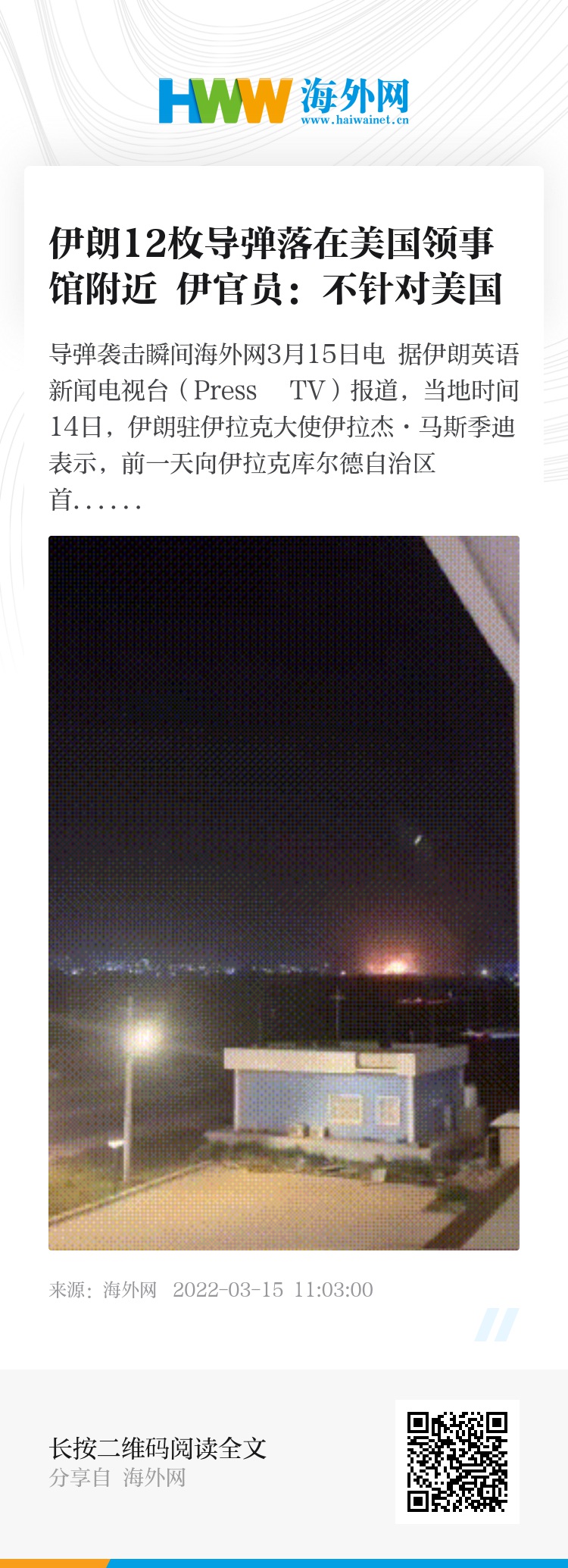海外网3月15日电 据伊朗英语新闻电视台(Press TV)报道,当地时间14日,伊朗驻伊拉克大使伊拉杰·马斯季迪表示,前一天向伊拉克库尔德自治区首府埃尔比勒发射导弹,是为了打击以色列情报机构摩萨德的间谍中心,而不是针对美国。