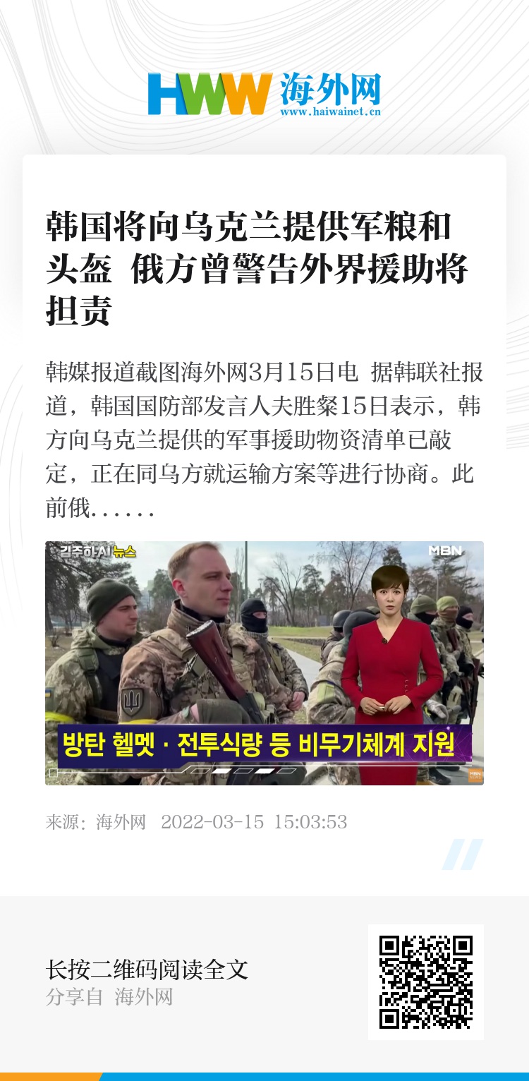 海外网3月15日电 据韩联社报道,韩国国防部发言人夫胜粲15日表示,韩方向乌克兰提供的军事援助物资清单已敲定,正在同乌方就运输方案等进行协商。此前俄罗斯方面曾警告外界援助将担责。