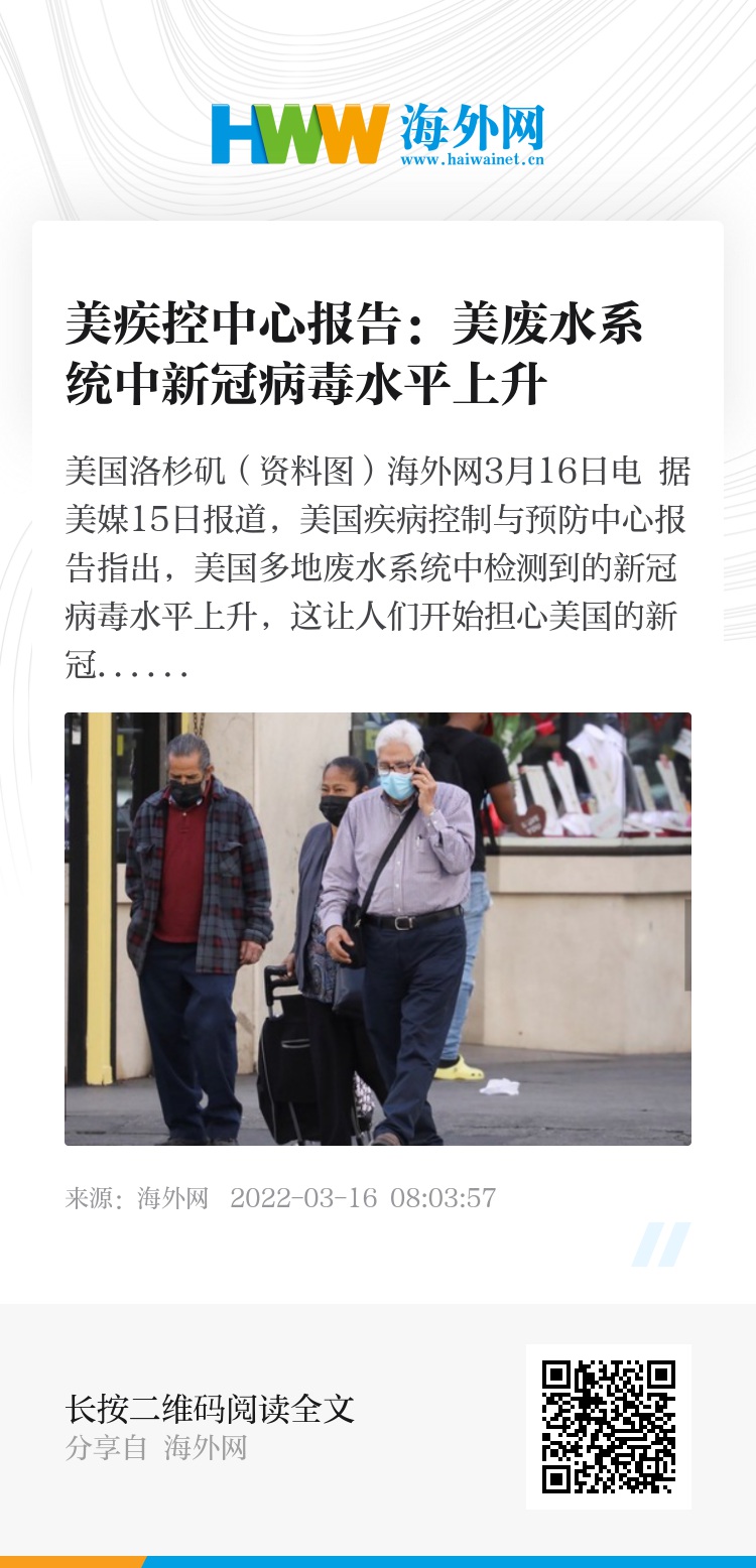 海外网3月16日电 据美媒15日报道,美国疾病控制与预防中心报告指出,美国多地废水系统中检测到的新冠病毒水平上升,这让人们开始担心美国的新冠病例可能会激增。