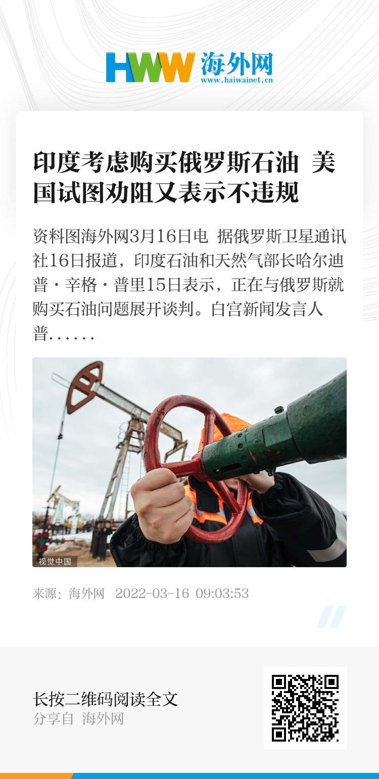海外网3月16日电 据俄罗斯卫星通讯社16日报道,印度石油和天然气部长哈尔迪普·辛格·普里15日表示,正在与俄罗斯就购买石油问题展开谈判。白宫新闻发言人普萨基当日试图劝阻印度这一决定,但同时表示这并不违反制裁规定。