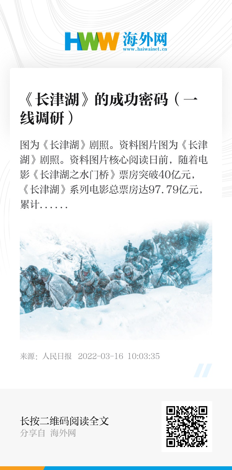 剧本从13万字改至6万字,3名导演联合执导,拍摄周期横跨两个冬季,集结了七八千人的演员队伍,整合了86家国内外后期特效制作公司,影片字幕滚动人名超过1.2万个……日前,随着电影《长津湖之水门桥》票房突破40亿元,《长津湖》系列电影总票房达97.79亿元,累计观影超2亿人次。《长津湖》系列电影刷新中国影史多项纪录,成功的背后,是中国电影人一次充满使命感的战斗。