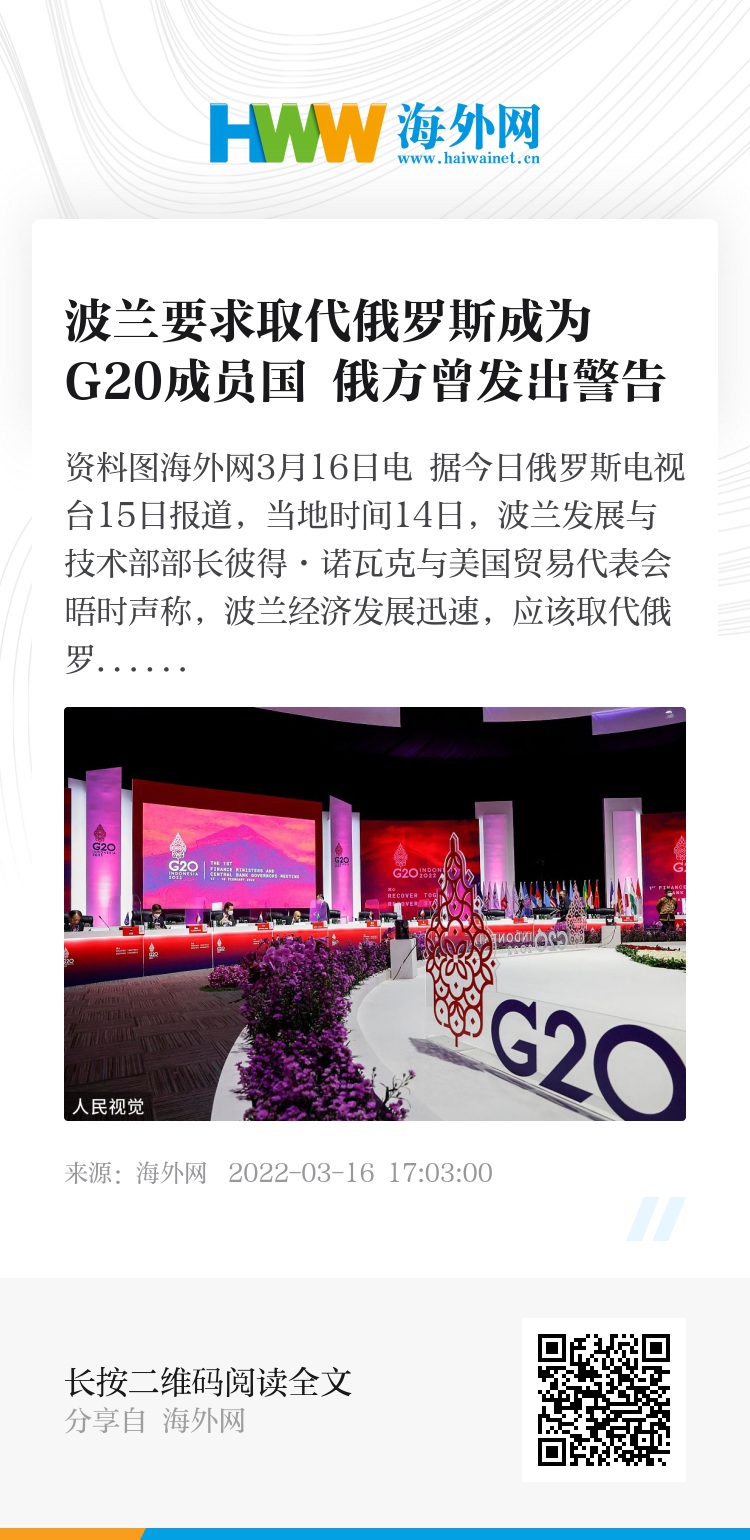 据报道,诺瓦克先是在G20国际论坛期间表示,波兰应该取代俄罗斯成为G20成员国,随后又在社交媒体上发文称:“不仅要把俄罗斯从G20中除名,还要把俄罗斯从G20金融稳定委员会中除名。”他声称,作为过去30年来全球增长第二快的国家,波兰应该在G20中占有一席。