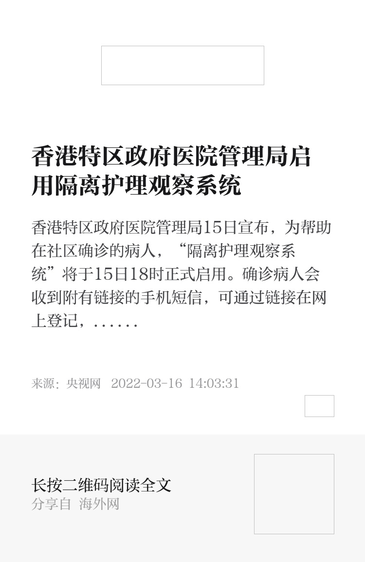 香港特区政府医院管理局15日宣布,为帮助在社区确诊的病人,“隔离护理观察系统”将于15日18时正式启用。确诊病人会收到附有链接的手机短信,可通过链接在网上登记,输入个人信息及检测资料、身体状况,患者可申报身体不适状况,例如高烧、低温、抽搐、胸或腹部不适等较严重的情况,系统会提示患者应前往急症室或联络社区隔离设施的职员。