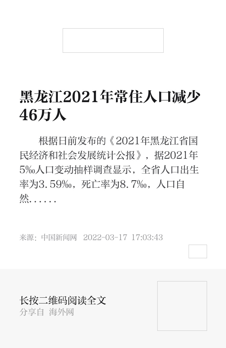 根据日前发布的《2021年黑龙江省国民经济和社会发展统计公报》,据2021年5‰人口变动抽样调查显示,全省人口出生率为3.59‰,死亡率为8.7‰,人口自然增长率为-5.11‰。年末常住总人口3125万人,比上年减少46万人。其中,城镇人口2052.8万人,乡村人口1072.2万人。65岁及以上人口占全省总人口的比重为16.8%。