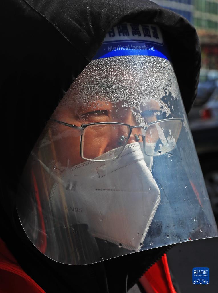 3月17日,在沈阳市大东区金星社区检测点,抗疫志愿者的面罩遇冷凝结了水珠。为抗击本轮疫情,沈阳市新冠肺炎疫情防控指挥部决定3月17日起在全市进行全员核酸检测。此时沈阳正遭遇降温天气,各个社区和部分爱心企业为抗疫医护人员和志愿者准备了热豆浆、暖贴等御寒物品,共克疫情。新华社记者 杨青摄