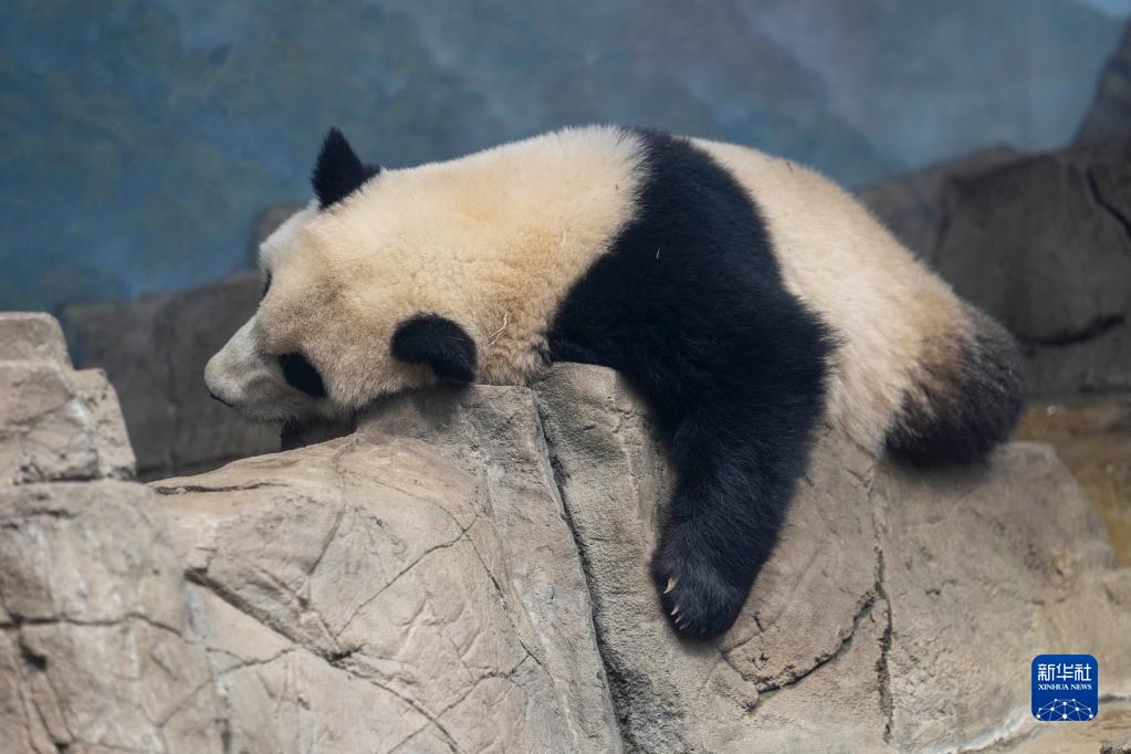 3月16日,大熊猫“小奇迹”在美国华盛顿史密森学会国家动物园休息。位于美国首都华盛顿西北部的史密森学会国家动物园16日在大熊猫馆设立大熊猫家谱影廊,启动大熊猫项目50周年系列庆祝活动。新华社记者 刘杰 摄