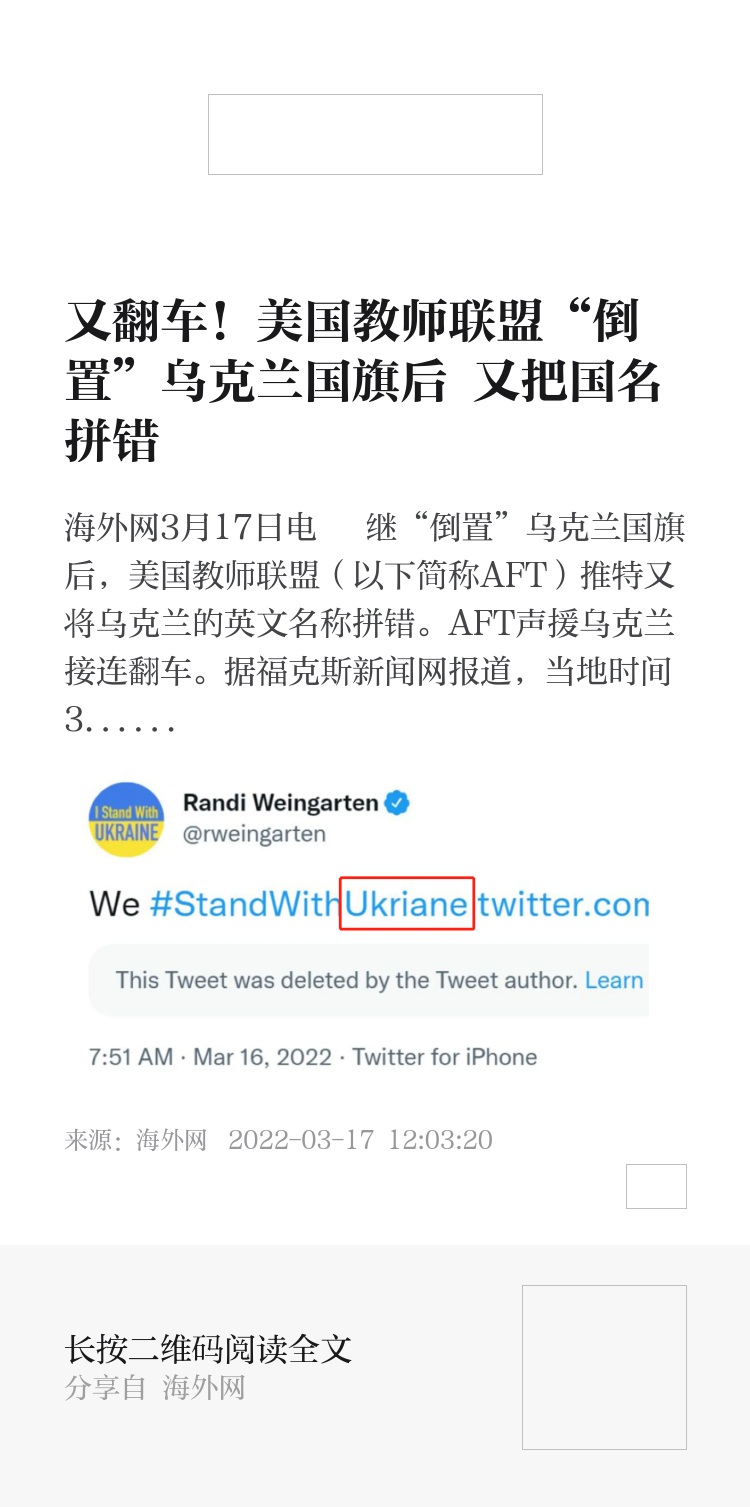 海外网3月17日电 继“倒置”乌克兰国旗后,美国教师联盟(以下简称AFT)推特又将乌克兰的英文名称拼错。AFT声援乌克兰接连翻车。