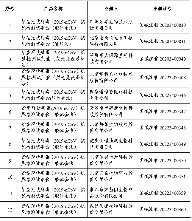资料显示,3月12日,国家药监局发布通告,批准南京诺唯赞、北京金沃夫、深圳华大因源、广州万孚生物、北京华科泰生物的新冠抗原产品自测应用申请变更。3月13日,国家药监局再批准5家新冠抗原产品的注册申请,分别为万泰生物、热景生物、天津博奥赛斯生物、重庆明道捷测生物和北京乐普诊断。