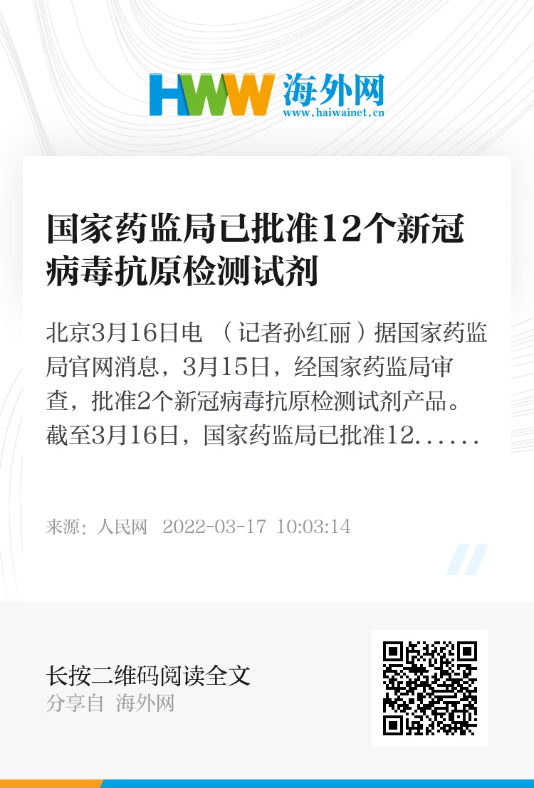人民网北京3月16日电 (记者孙红丽)据国家药监局官网消息,3月15日,经国家药监局审查,批准2个新冠病毒抗原检测试剂产品。截至3月16日,国家药监局已批准12个新冠病毒抗原检测试剂产品。