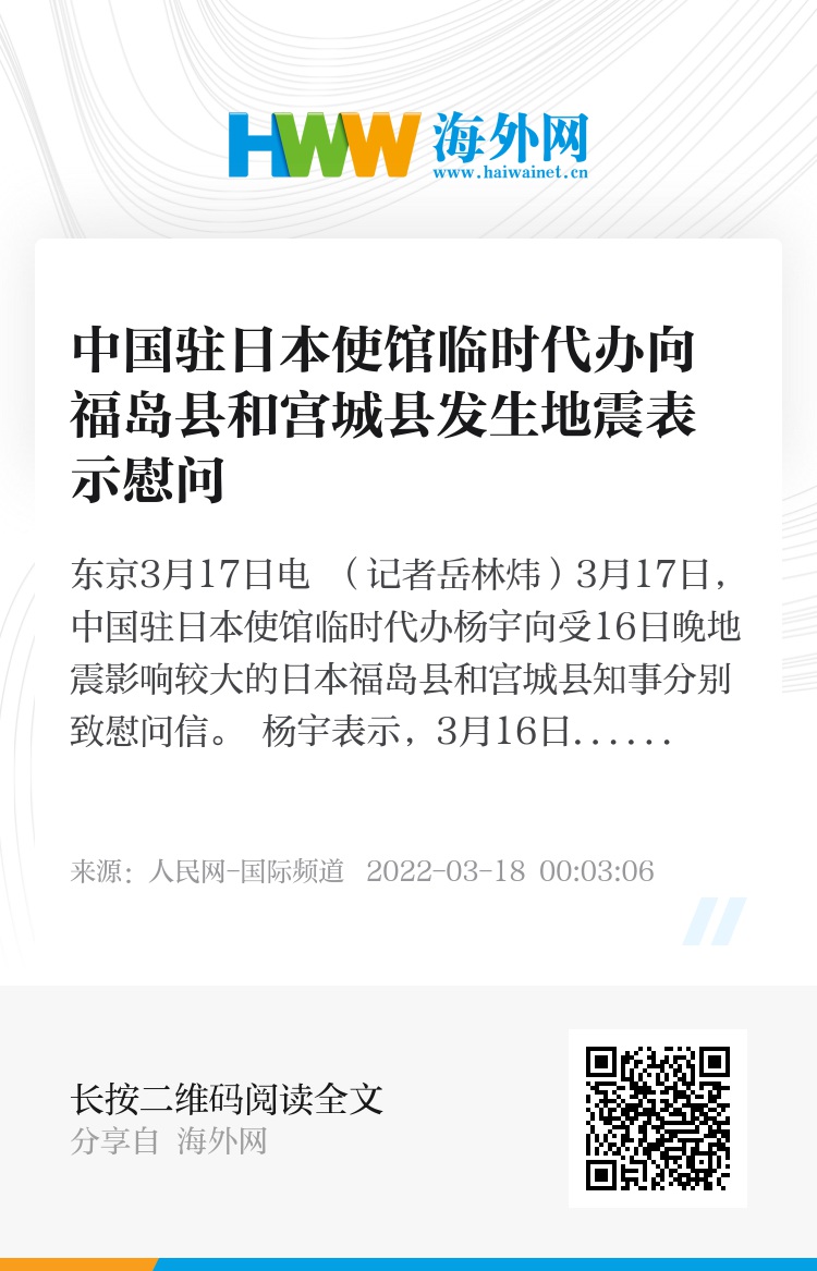 人民网东京3月17日电 (记者岳林炜)3月17日,中国驻日本使馆临时代办杨宇向受16日晚地震影响较大的日本福岛县和宫城县知事分别致慰问信。