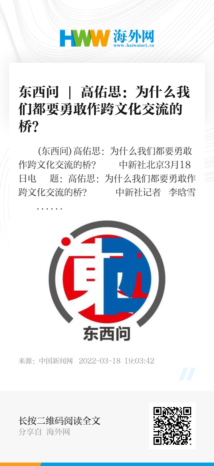 中新社北京3月18日电 题:高佑思:为什么我们都要勇敢作跨文化交流的桥?