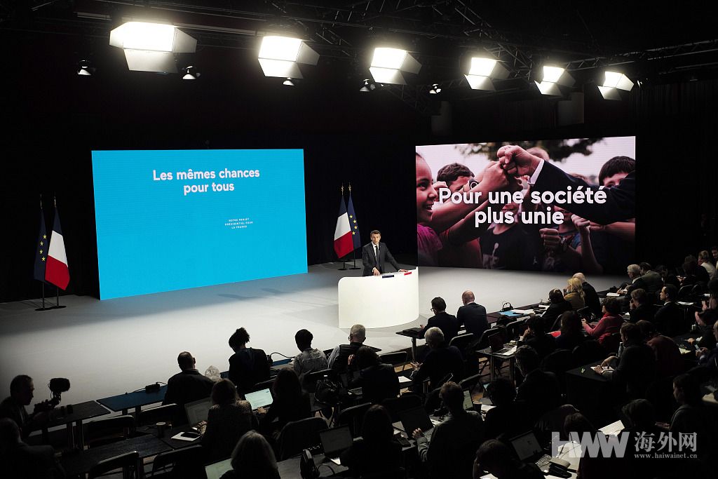 当地时间2022年3月17日下午,法国巴黎北郊圣丹尼省,法国总统马克龙举行新闻发布会,详细介绍他参加2022总统大选的竞选纲领。马克龙竞选纲领围绕教育、健康、购买力等方面主题展开。另外,马克龙还将于4月2日举行大型竞选集会,2022法国总统大选第一轮投票将于4月10日举行。(图:视觉中国)