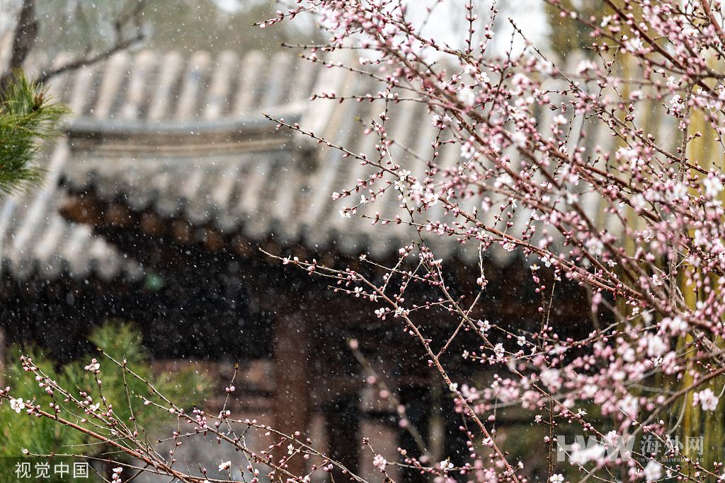 北京三月迎降雪 春雪飘洒与春花相映成趣