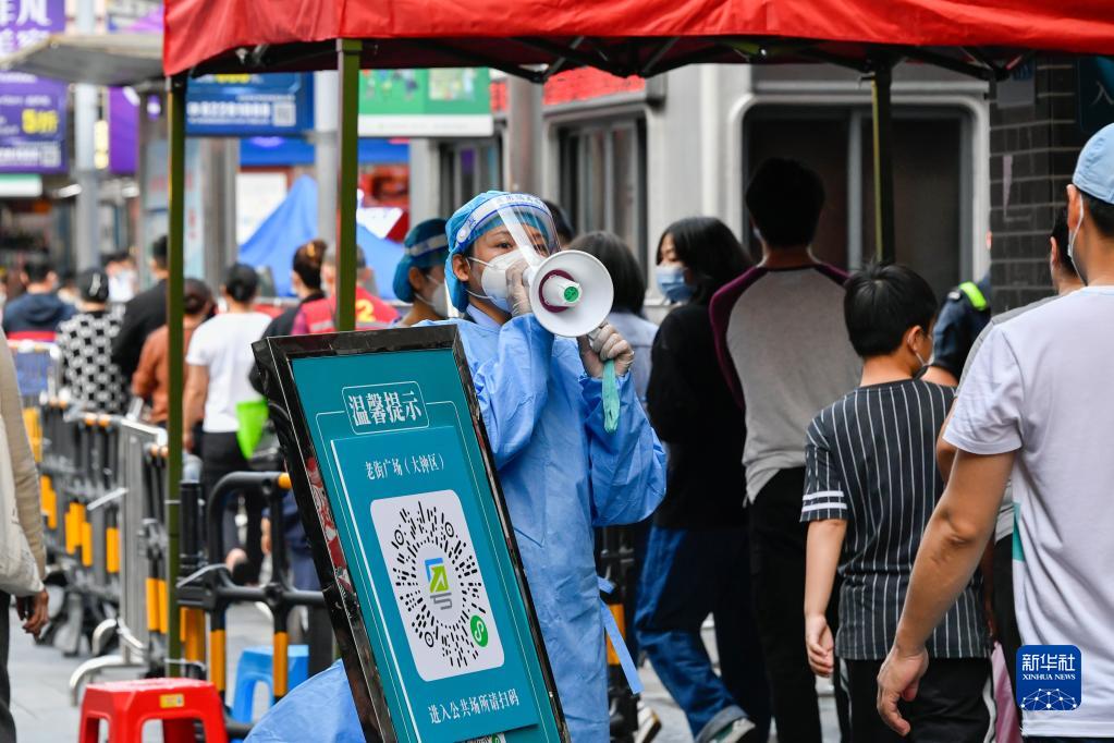 3月13日,志愿者在深圳罗湖区东门广场核酸检测点引导居民。新华社发(储焱摄)