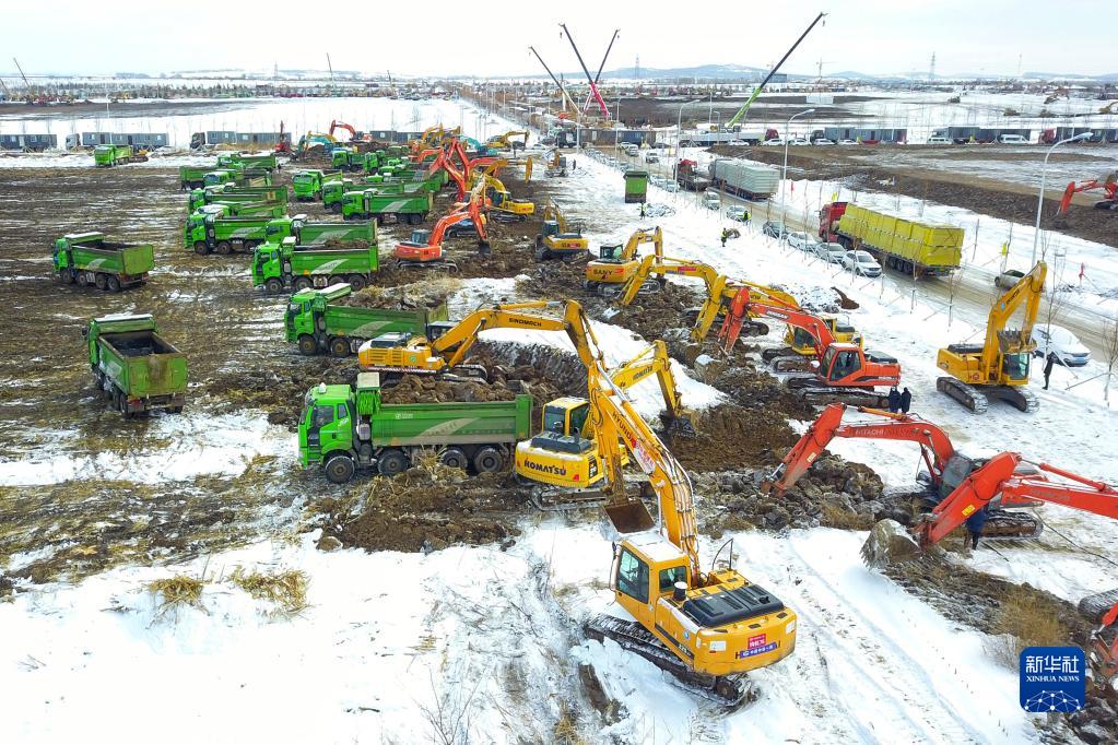 3月16日拍摄的吉林长春兴隆山保税区方舱隔离点一期施工现场(无人机照片)。新华社发(张扬摄)