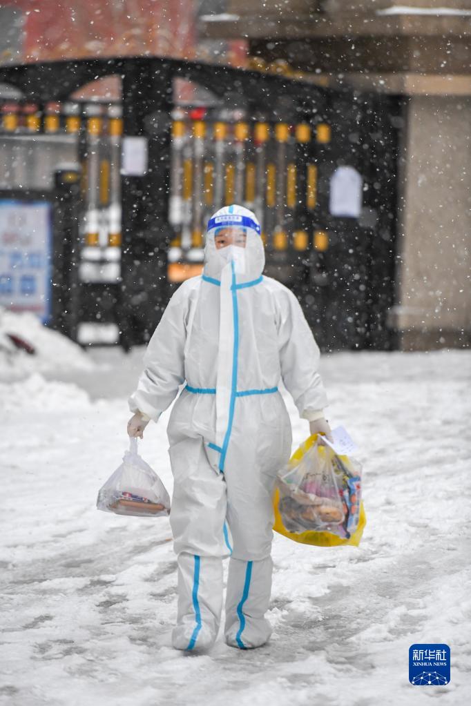 3月15日,吉林省吉林市昌邑区兴华街道中兴社区网格员宋冉为隔离居民运送生活物资。新华社记者 张楠 摄