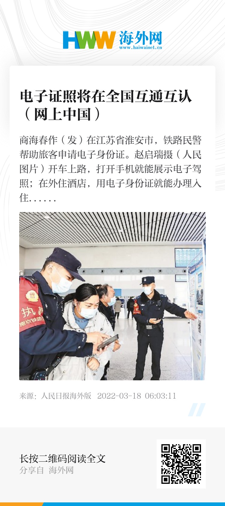 开车上路,打开手机就能展示电子驾照;在外住酒店,用电子身份证就能办理入住手续;企业的办事员不必带着公章、纸质材料到处跑,线上上传文件就加盖了电子印章……电子证照的推广正在为人们生活、工作带来更多便利。今年政府工作报告提出,加强数字政府建设,推动政务数据共享,进一步压减各类证明事项,扩大“跨省通办”范围,基本实现电子证照互通互认,便利企业跨区域经营,加快解决群众关切事项的异地办理问题。