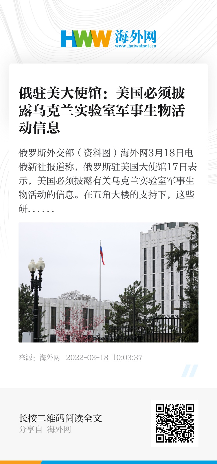 海外网3月18日电 俄新社报道称,俄罗斯驻美国大使馆17日表示,美国必须披露有关乌克兰实验室军事生物活动的信息。在五角大楼的支持下,这些研究不可能是和平目的。