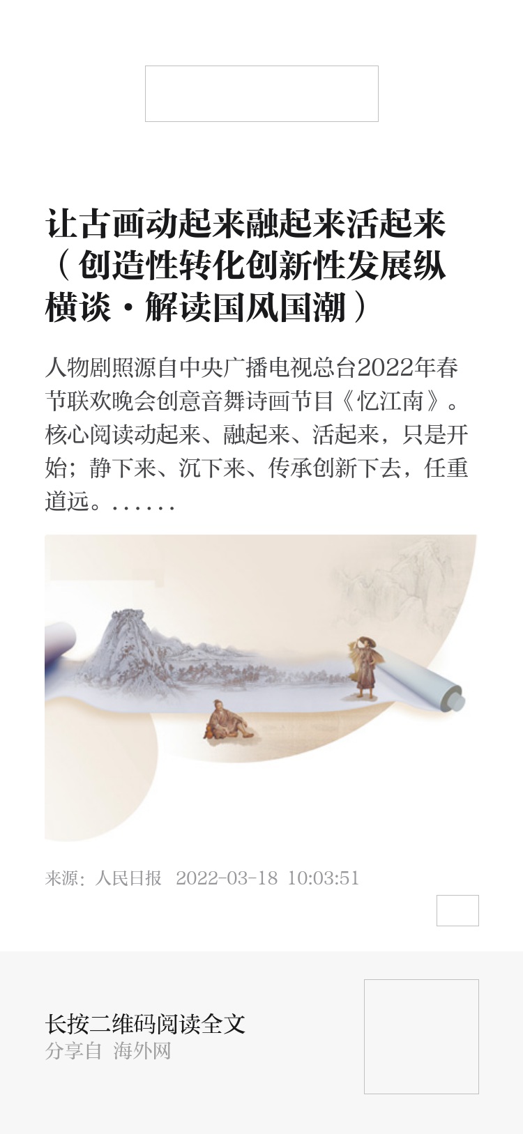 围绕古画的这些“动起来”,虽不能取代对原作的欣赏,但无疑打开了普通人接近传统瑰宝的通道。有人说:古画动了,世界静了。古画所蕴含的文化富矿一经打开,悠远的历史场景、历经岁月沉淀的色彩、饱蘸感情的笔触、娴熟精湛的技艺,一下子把人拉回到“从前慢”的时代。还有人说:古画动了,身体里的DNA也跟着动了。古人的丹青创作和今人的形式创新两相碰撞,唤醒了观众内心对中华文化的认同和自信。