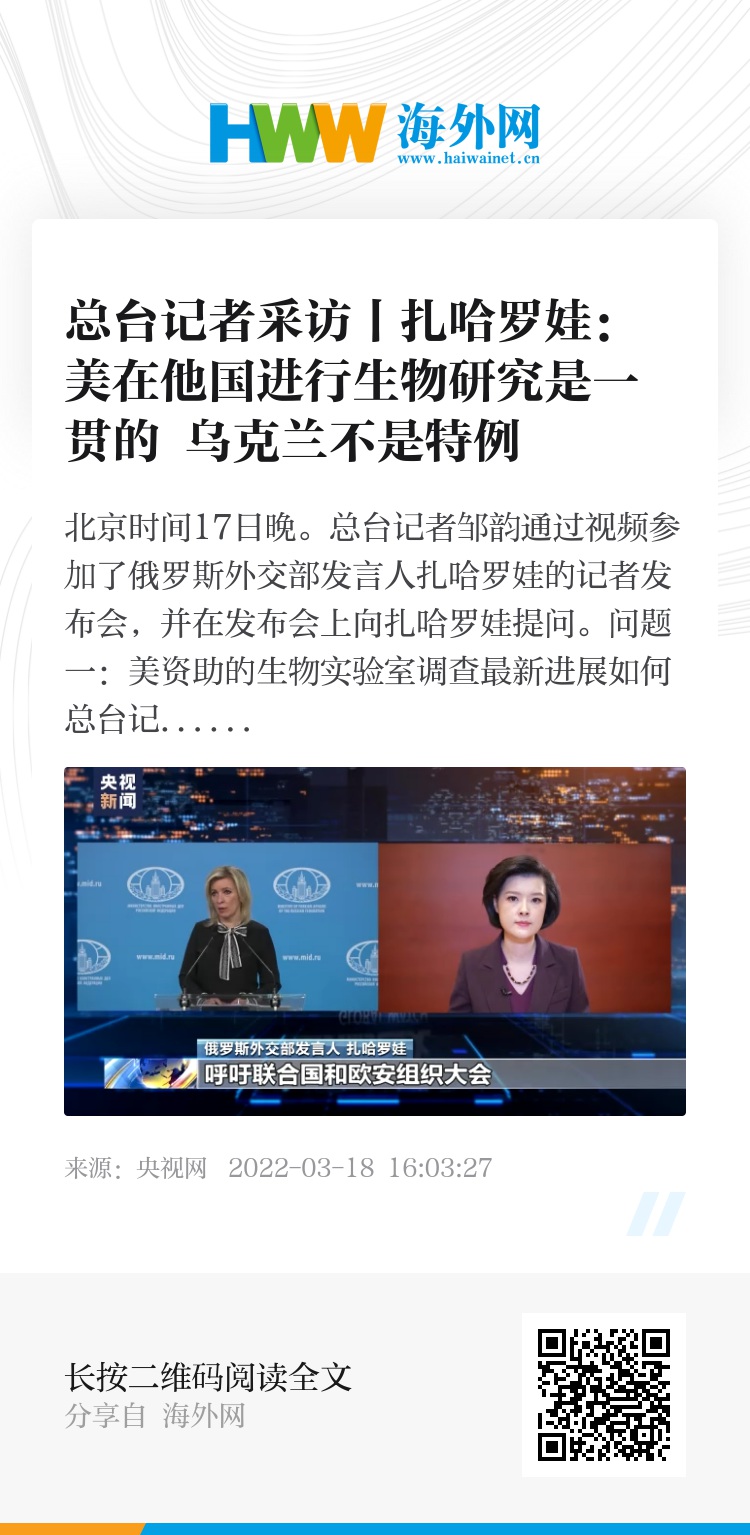 俄罗斯外交部发言人 扎哈罗娃:至于您提出的这个非常直接的问题,我已经多次强调,这些在俄罗斯的邻国开展的生物研究活动得到了美国的资助,并且有着巨大风险。