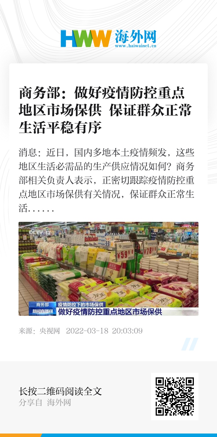 央视网消息:近日,国内多地本土疫情频发,这些地区生活必需品的生产供应情况如何?商务部相关负责人表示,正密切跟踪疫情防控重点地区市场保供有关情况,保证群众正常生活平稳有序。