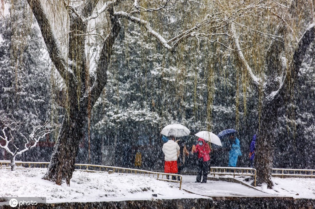 3月18日,北京,阳春三月,一场大雪,颐和园的雪中美景,醉了春天,醉了游人拍客。开放的花上,吐绿的柳上,嫩青的叶上盖着晶莹洁白的雪,仿佛幅幅迷人的“春画”,让人啧啧赞叹,人们禁不住美景吸引,冒雪赏景拍照。图片来源: 黄重金/IC photo