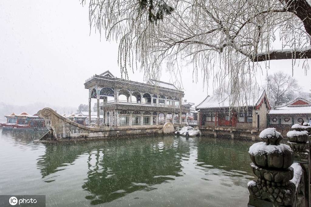 3月18日,北京,阳春三月,一场大雪,颐和园的雪中美景,醉了春天,醉了游人拍客。开放的花上,吐绿的柳上,嫩青的叶上盖着晶莹洁白的雪,仿佛幅幅迷人的“春画”,让人啧啧赞叹,人们禁不住美景吸引,冒雪赏景拍照。图片来源: 黄重金/IC photo