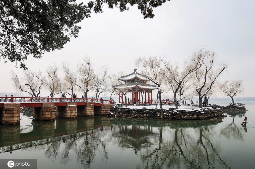 3月18日,北京,阳春三月,一场大雪,颐和园的雪中美景,醉了春天,醉了游人拍客。开放的花上,吐绿的柳上,嫩青的叶上盖着晶莹洁白的雪,仿佛幅幅迷人的“春画”,让人啧啧赞叹,人们禁不住美景吸引,冒雪赏景拍照。图片来源: 黄重金/IC photo