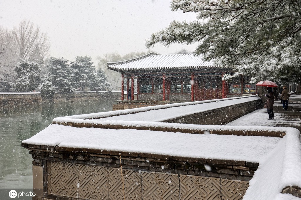 3月18日,北京,阳春三月,一场大雪,颐和园的雪中美景,醉了春天,醉了游人拍客。开放的花上,吐绿的柳上,嫩青的叶上盖着晶莹洁白的雪,仿佛幅幅迷人的“春画”,让人啧啧赞叹,人们禁不住美景吸引,冒雪赏景拍照。图片来源: 黄重金/IC photo