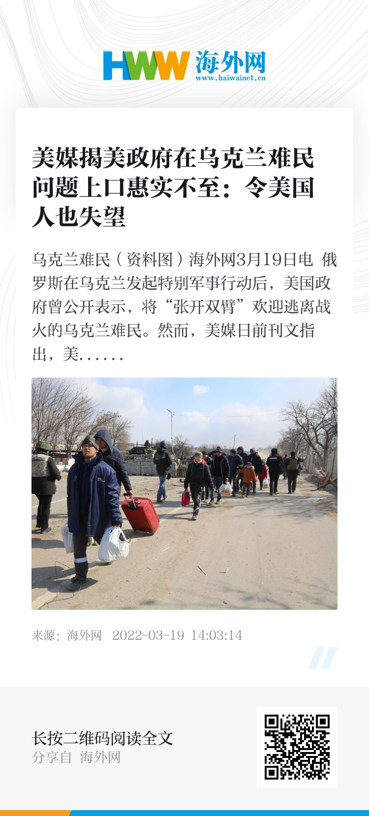 海外网3月19日电 俄罗斯在乌克兰发起特别军事行动后,美国政府曾公开表示,将“张开双臂”欢迎逃离战火的乌克兰难民。然而,美媒日前刊文指出,美国政府在乌克兰难民问题上口惠实不至,令美国人也失望。