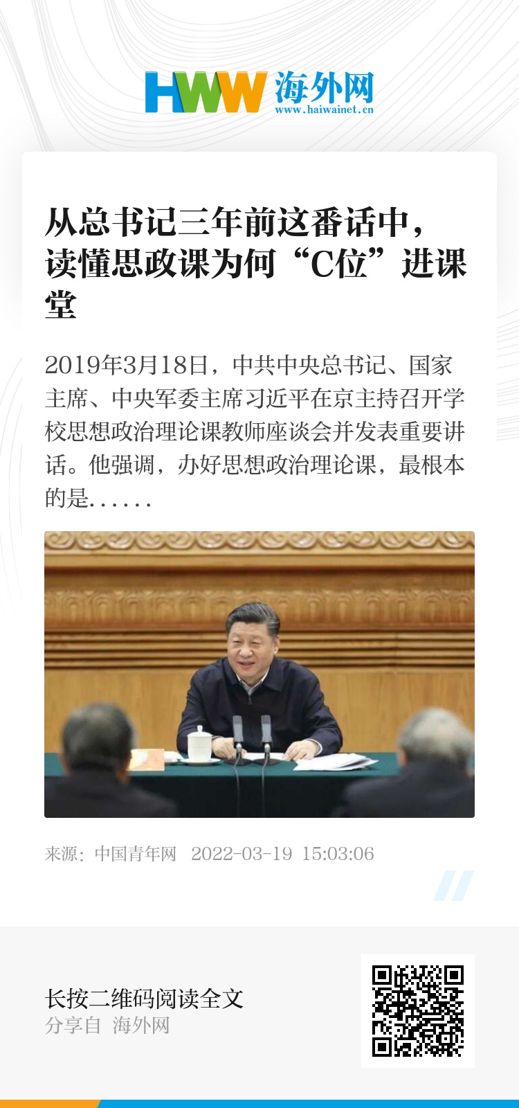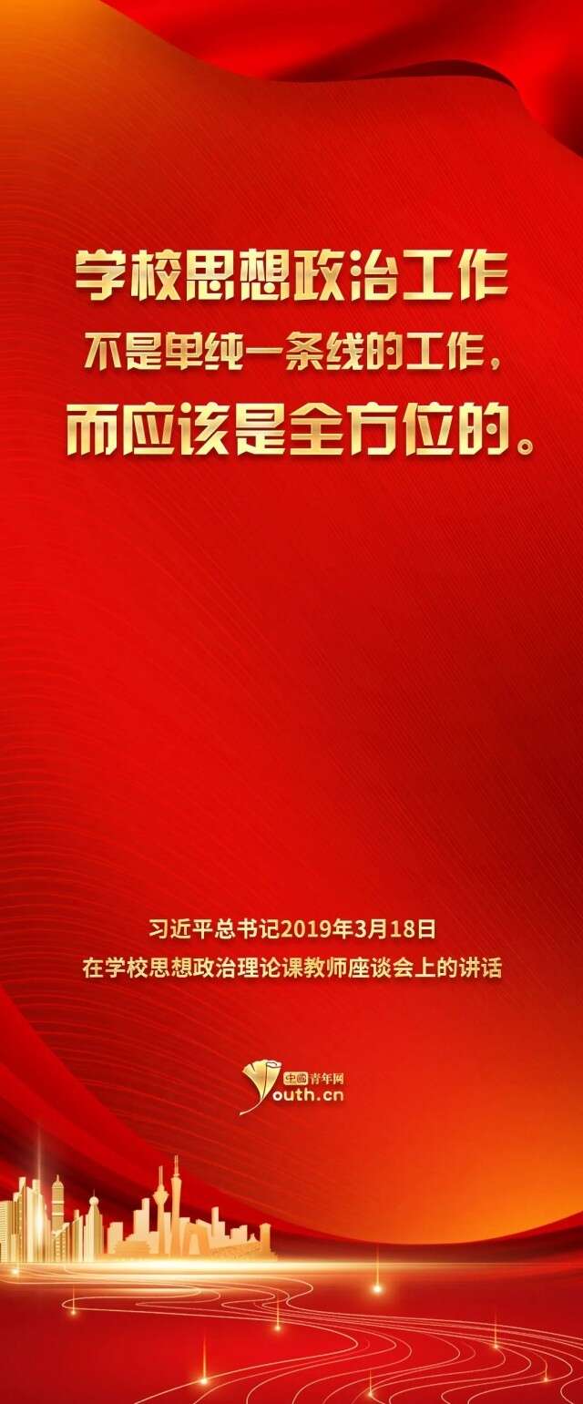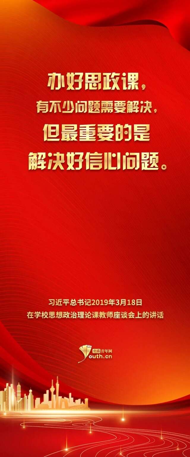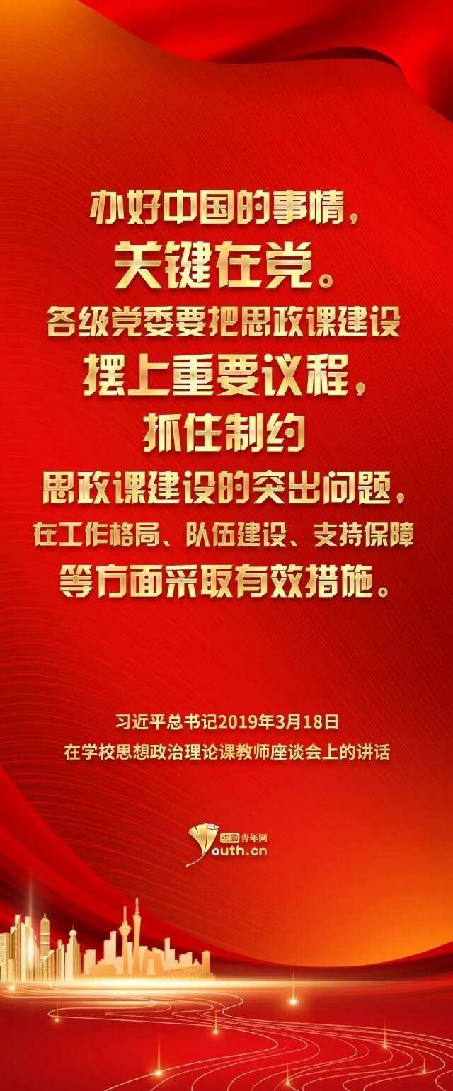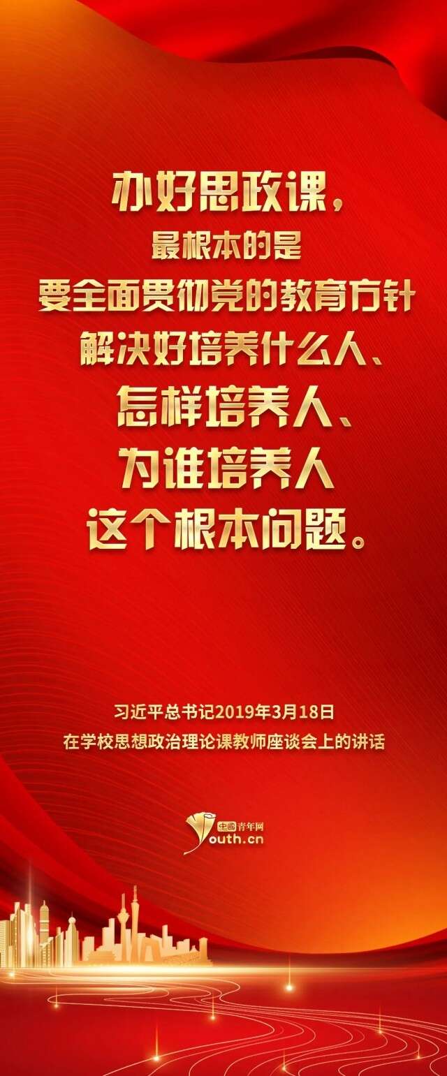 2019年3月18日,中共中央总书记、国家主席、中央军委主席习近平在京主持召开学校思想政治理论课教师座谈会并发表重要讲话。他强调,办好思想政治理论课,最根本的是要全面贯彻党的教育方针,解决好培养什么人、怎样培养人、为谁培养人这个根本问题。