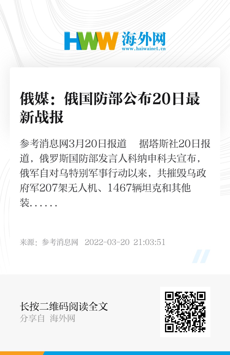 参考消息网3月20日报道 据塔斯社20日报道,俄罗斯国防部发言人科纳申科夫宣布,俄军自对乌特别军事行动以来,共摧毁乌政府军207架无人机、1467辆坦克和其他装甲车辆、148台多管火箭炮、573门野战火炮和迫击炮、1262辆特种军车。(编译/童师群)