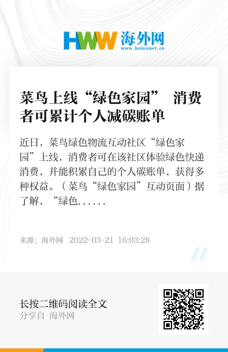 王昊苏表示,“绿色家园”将菜鸟绿色回收、纸箱换鸡蛋活动、消费者个人减碳账单等集合在线上,形成菜鸟绿色物流线上运营阵地,未来还将与整个阿里巴巴电商生态以及社会其他减碳生态打通,带动更广泛的减碳行为。【推广】